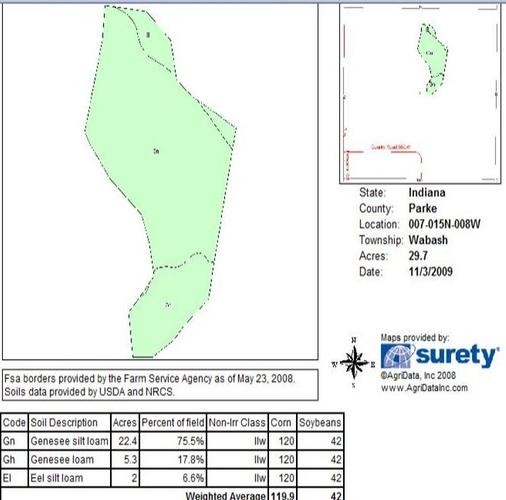 Surrounding properties consist of large timber tracts and agricultural fields. Pond creek and Big Raccoon creek serve as major travel routes for deer and turkey and offer exceptional water fowl wing shooting, fishing and trapping.