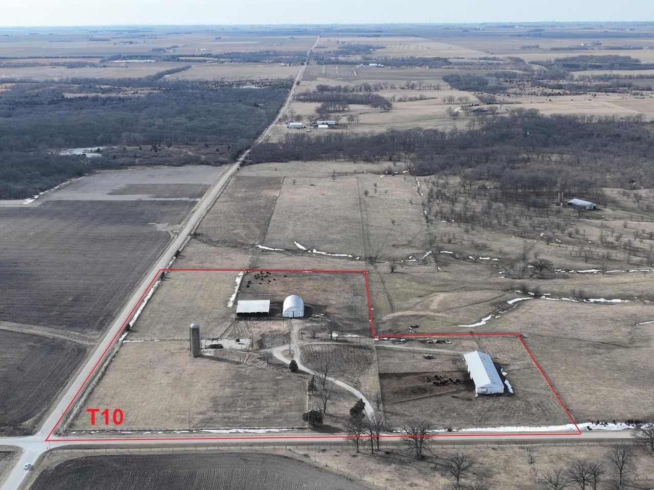 T10: +/- 12.50 acres in total with outbuildings, electricity and well. Fenced for cattle.