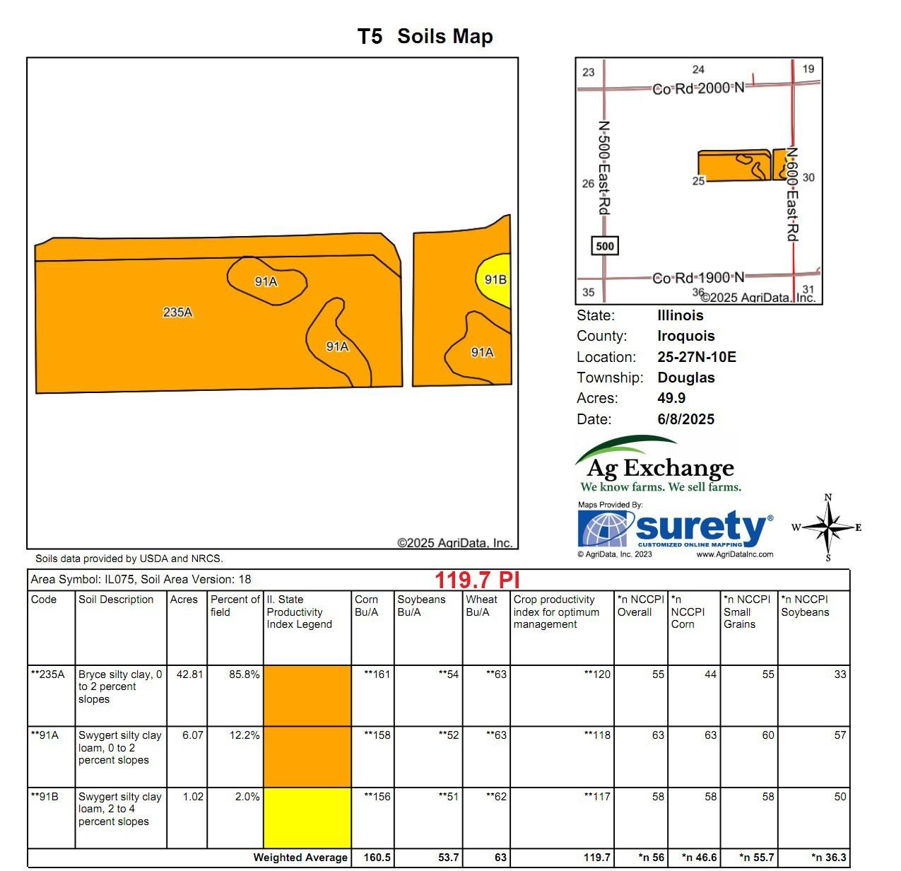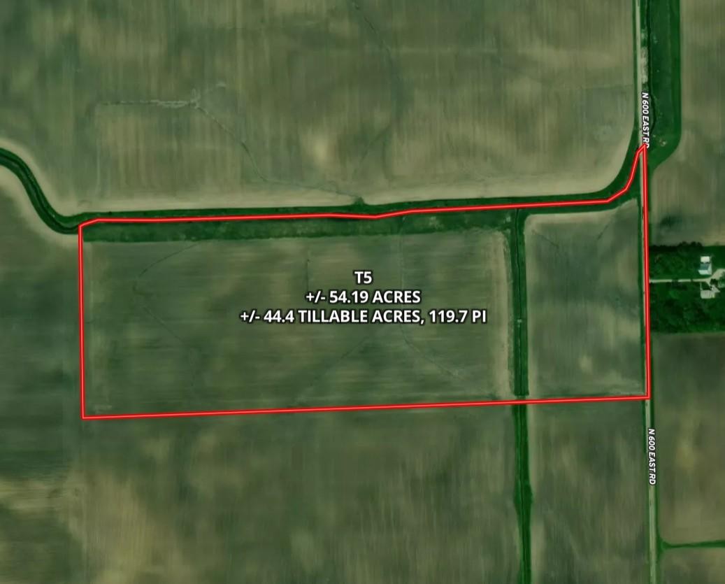 T5: +/- 54.19 acres, +/- 49.9 cropland acres, 119.7 PI consisting of +/- 44.4 tillable acres, and 5.50 CRP acres paying $1,373 annually, expiring fall of 2034.