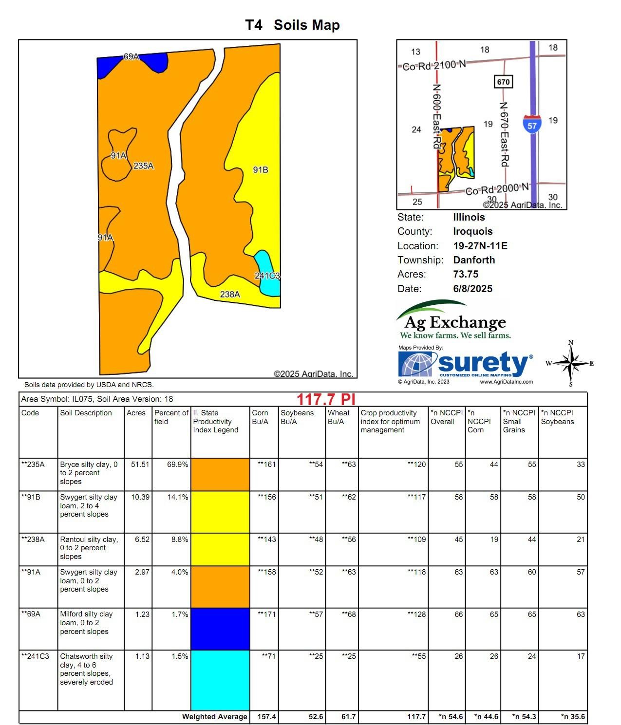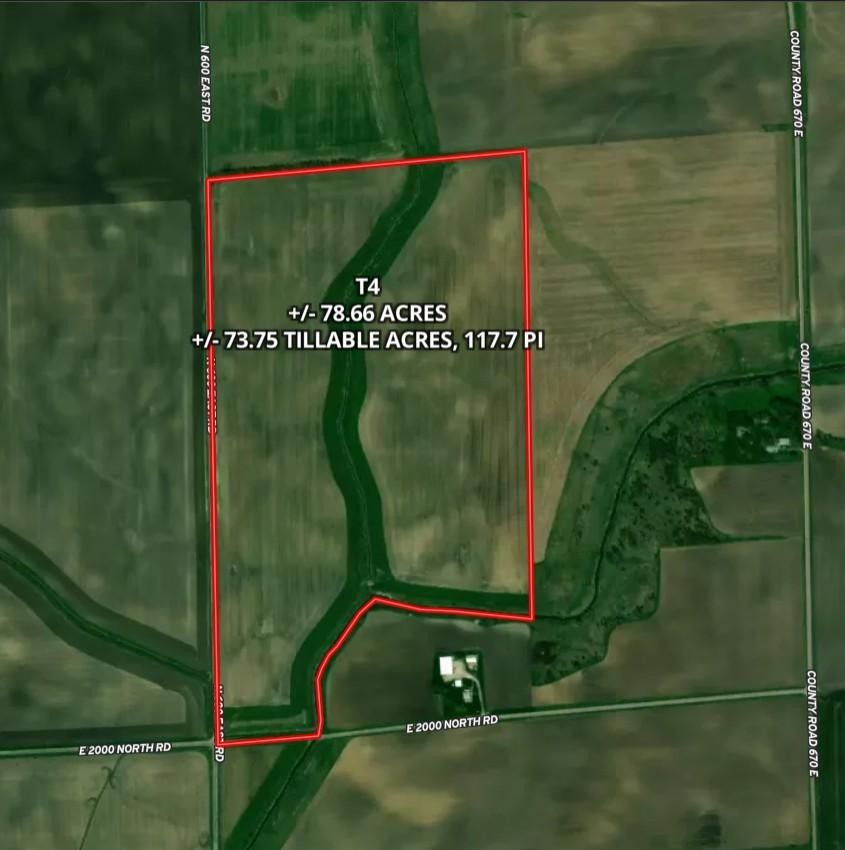 T4: +/- 78.66 acres, +/- 73.75 cropland acres, 117.7 PI consisting of +- 64.45 tillable acres, and +/- 9.3 CRP acres paying $2,705 annually, expiring fall of 2026.