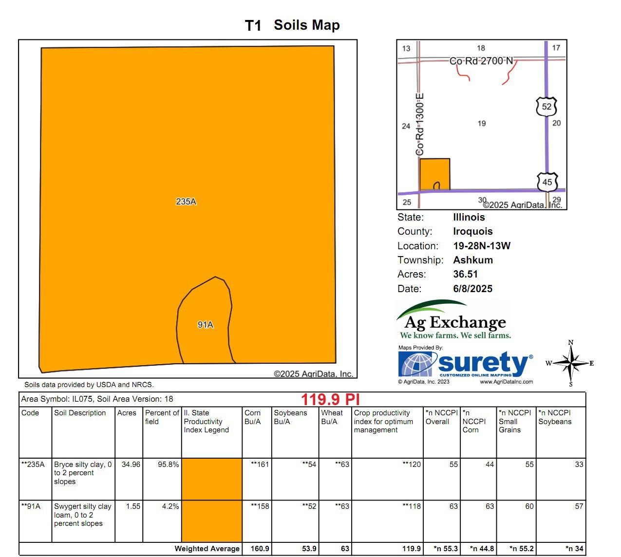 T1: +/- 37.05 acres, +/- 36.51 tillable acres, 119.9 PI