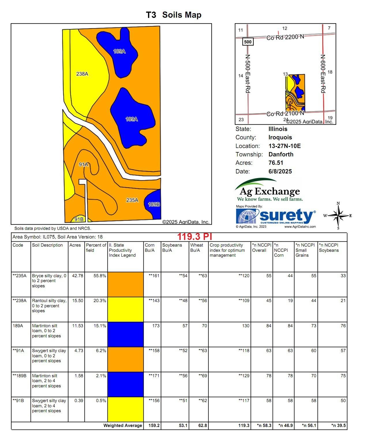 T3: +/- 80 acres, +/- 76.58 cropland acres, 119.3 PI consisting of +/- 66.88 tillable acres, and 9.7 CRP acres paying $2,806 annually, expiring fall of 2027.